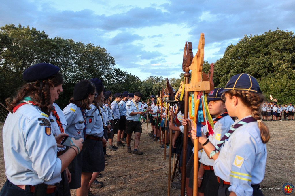 Al día siguiente fue cuando construimos durante la mañana todas las construcciones cómo, por ejemplo: la mesa, tendedero, zona de veladas, etc. Por la tarde tuvimos la ceremonia de Obertura del campamento. Todos formamos en semicírculo alrededor del Gran Pavés. Éramos unas 500 personas reunidas allí para darnos mutuamente la bienvenida. Después de la formación hubo la Misa inaugural. ¡Fue una ceremonia espectacular!
