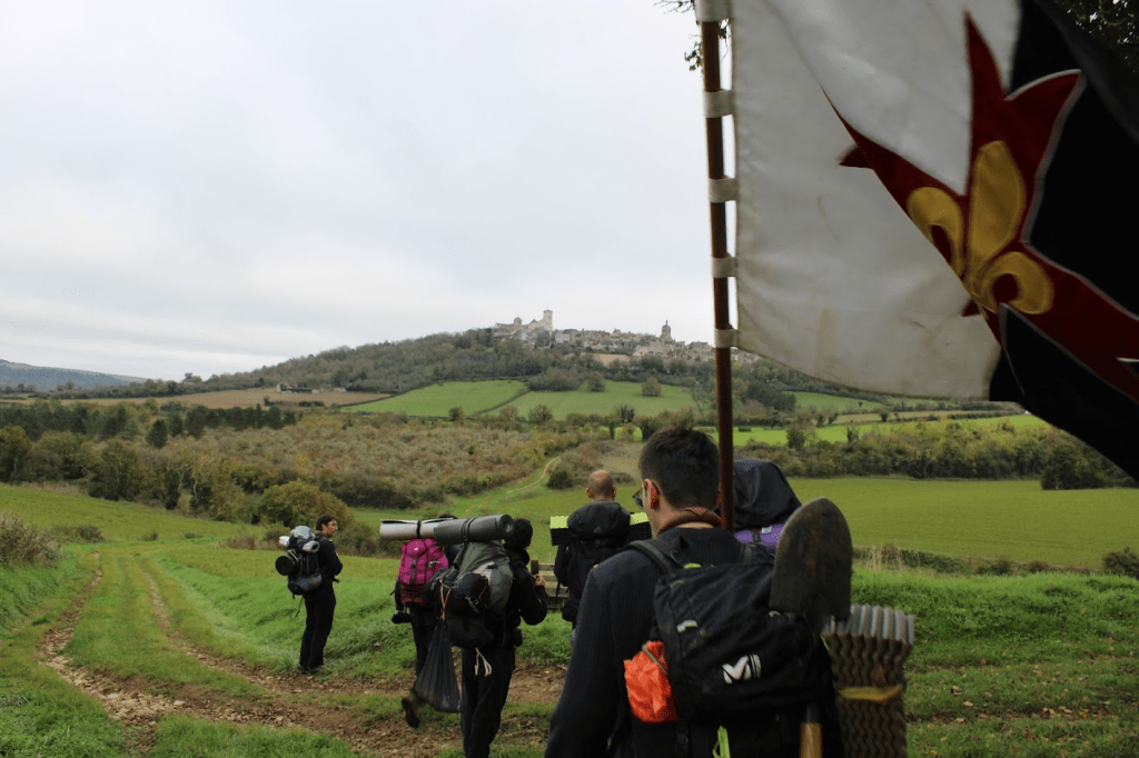 Després de tres dies de caminar, vam acampar al poble de Vézelay amb la basílica de Vézelay a l’horitzó. Anaven arribant grups d’scouts amb banderes enormes, cantant a ple pulmó, incloent un grup amb gaites (vaig preguntar i no eren pas escocesos!). Cada grup té el seu Baussant i portar-lo a la ruta o a la Missa és un honor.